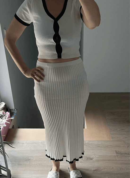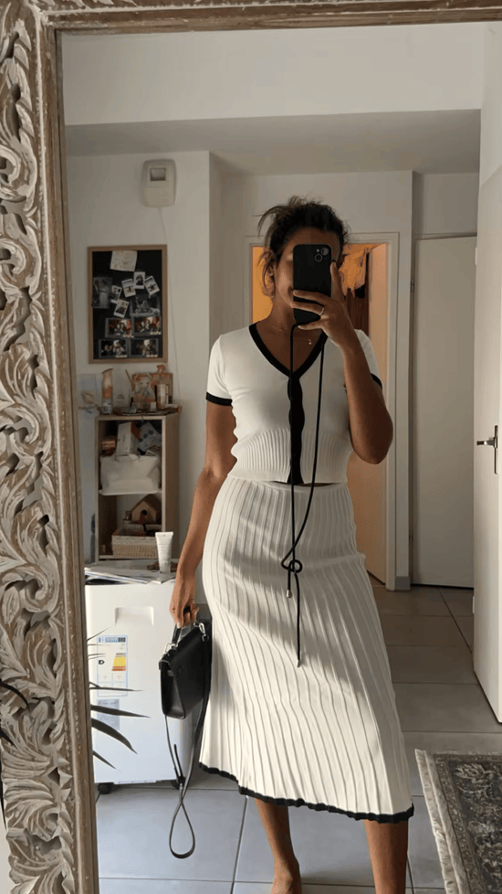 تعتبر كاتيمي بلوزة قصيرة الأكمام مع فتحة عميقة وإغلاق بأزرار من الأمام. مصنوعة من قماش ناعم، يتميز نسيجها المقلم وحافتها عند الحافة بتأثير مميز يبرز الجسم. فتحة الصدر، وإغلاق الأزرار، وحواف الأكمام مزينة بحواف متباينة تبرز اللون العاجي الرائع. هذه البلوزة، الجذابة، البسيطة والمريحة، تتميز بتصميمها السهل والعملي. متعددة الاستخدامات، يمكن ارتداؤها مع جينز للحصول على أسلوب غير رسمي.